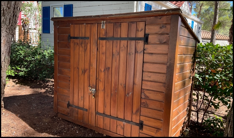 - Cabanon avec deux étagères, deux étendoirs extérieurs, un tuyau d'arrosage sur enrouleur,
