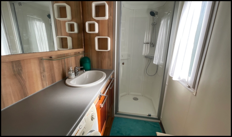 -d'une salle de douche (lavabo, cabine de douche, lave-linge, rangements divers ...)