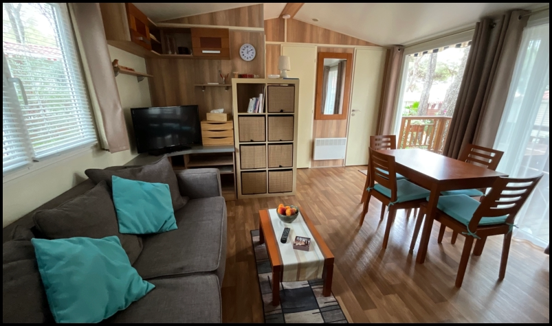 - d'un salon et d'un coin repas dont la table pour quatre personnes est convertible pour six (TV,